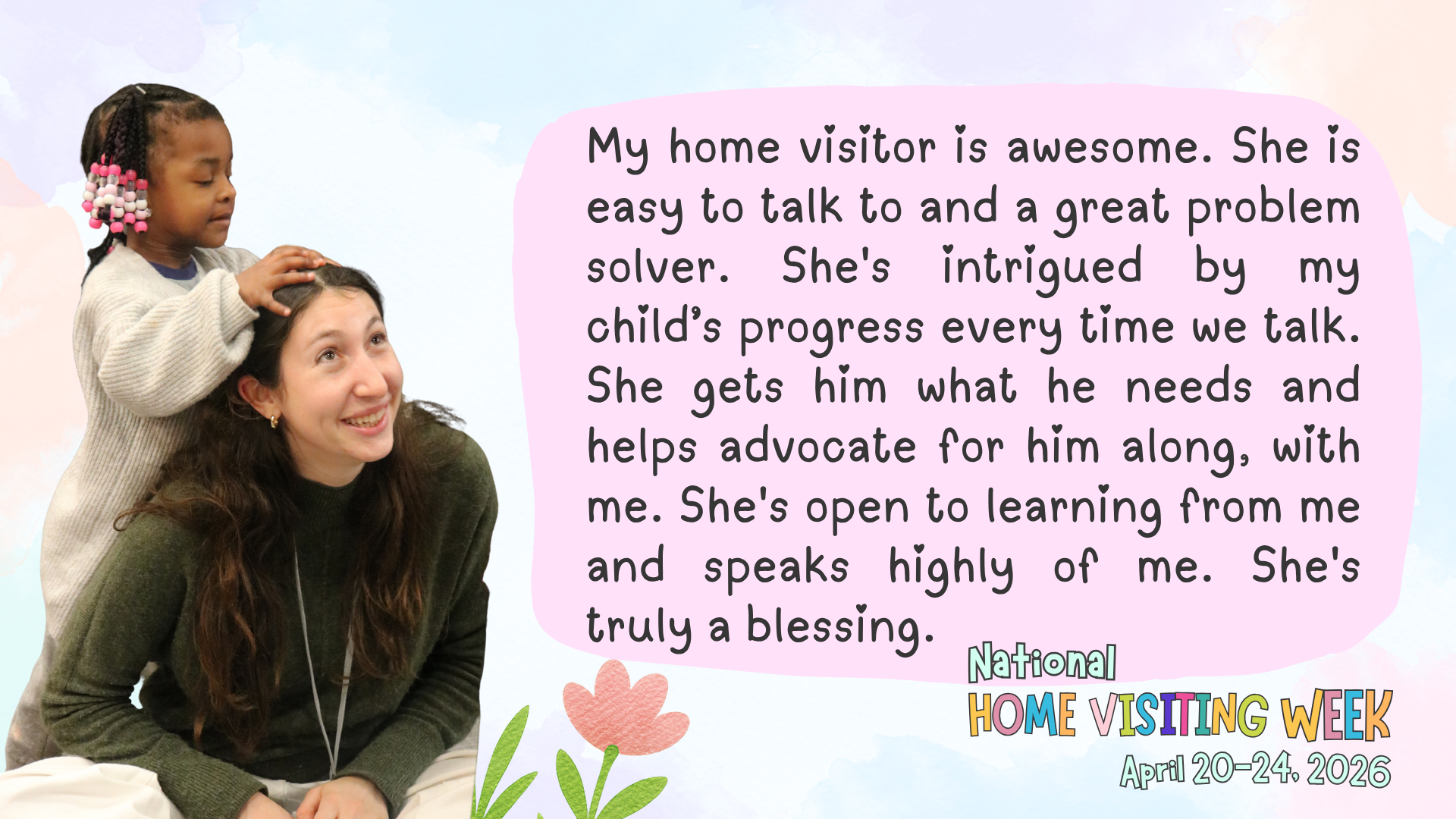My home visitor is awesome. She is easy to talk to and a great problem solver. She's intrigued by my child’s progress every time we talk. She gets him what he needs and helps advocate for him, along with me. She's open to learning from me and speaks highly of me. She's truly a blessing.