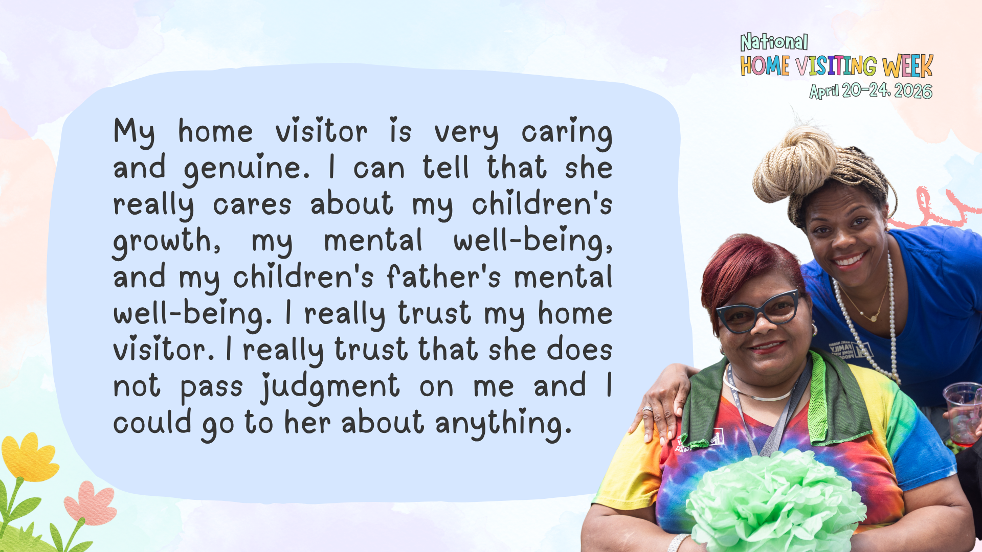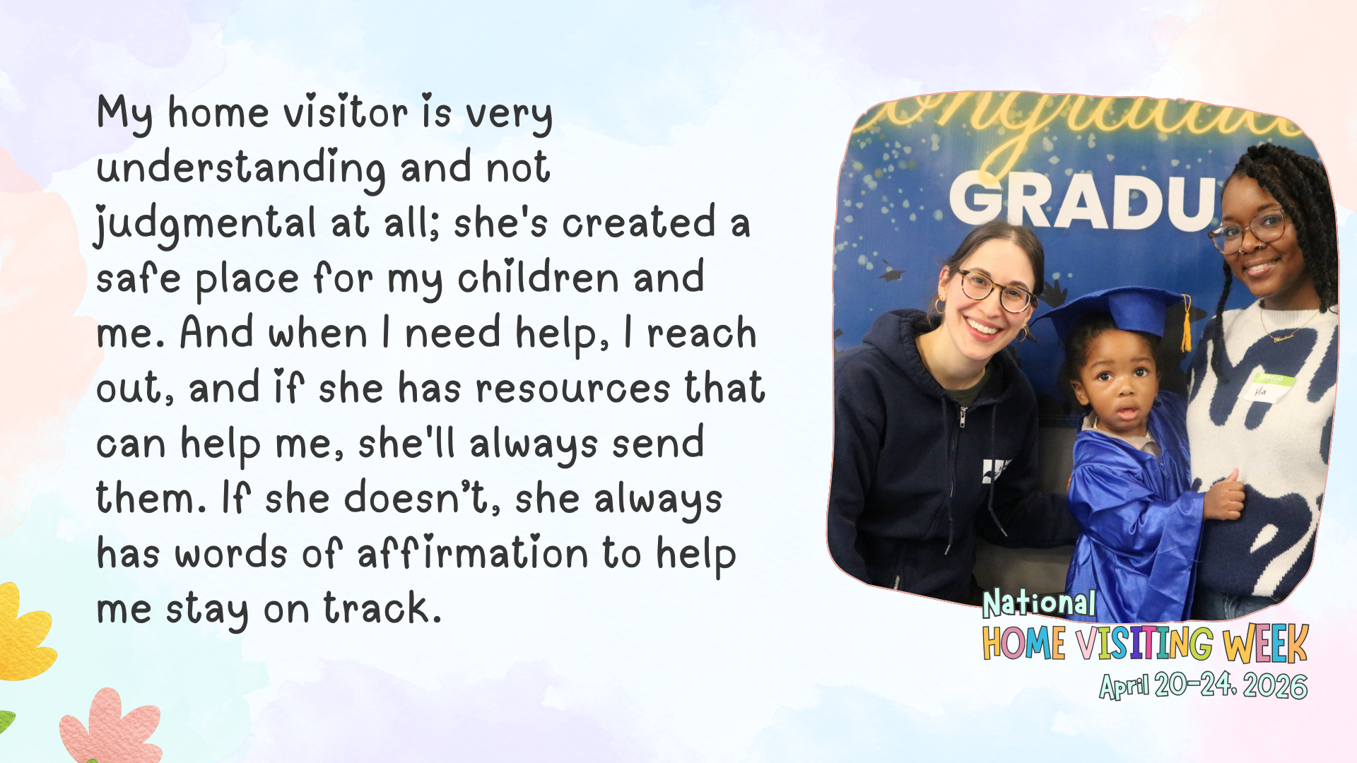 My home visitor is very understanding and not judgmental at all; she's created a safe place for my children and me. And when I need help, I reach out, and if she has resources that can help me, she'll always send them. If she doesn’t, she always has words of affirmation to help me stay on track.
